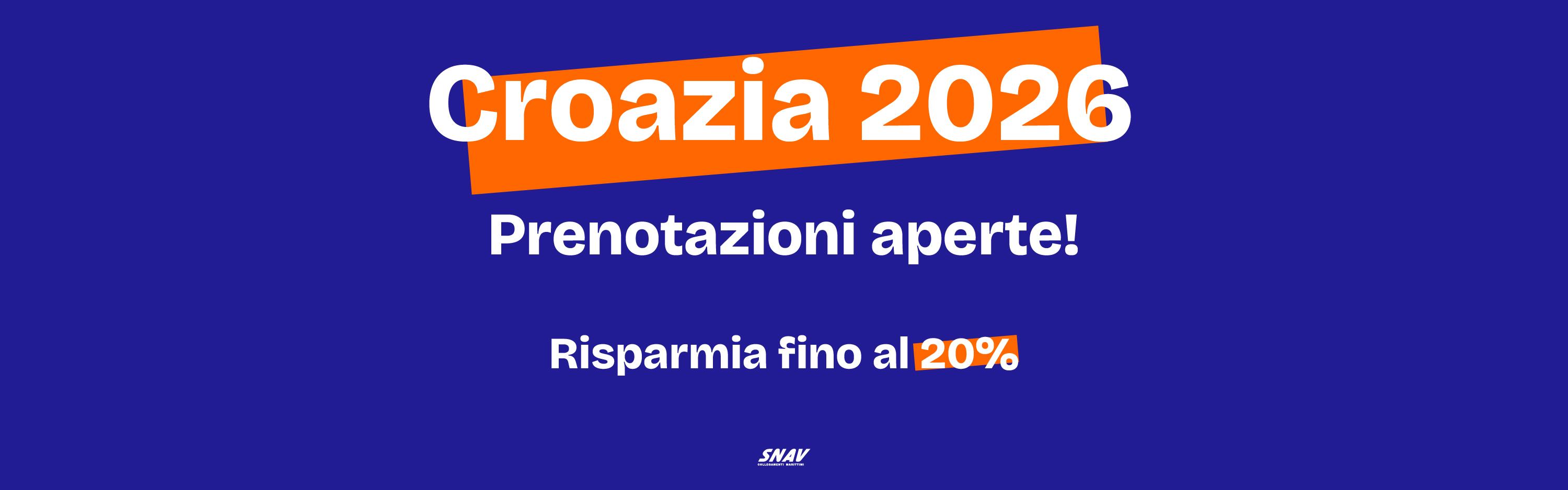 Inizia a sognare da subito la tua estate 2026: prenota oggi il tuo viaggio verso la splendida Croazia e approfitta degli sconti SNAV fino al 20% e al ritorno puoi imbarcare gratis la tua auto o moto*!